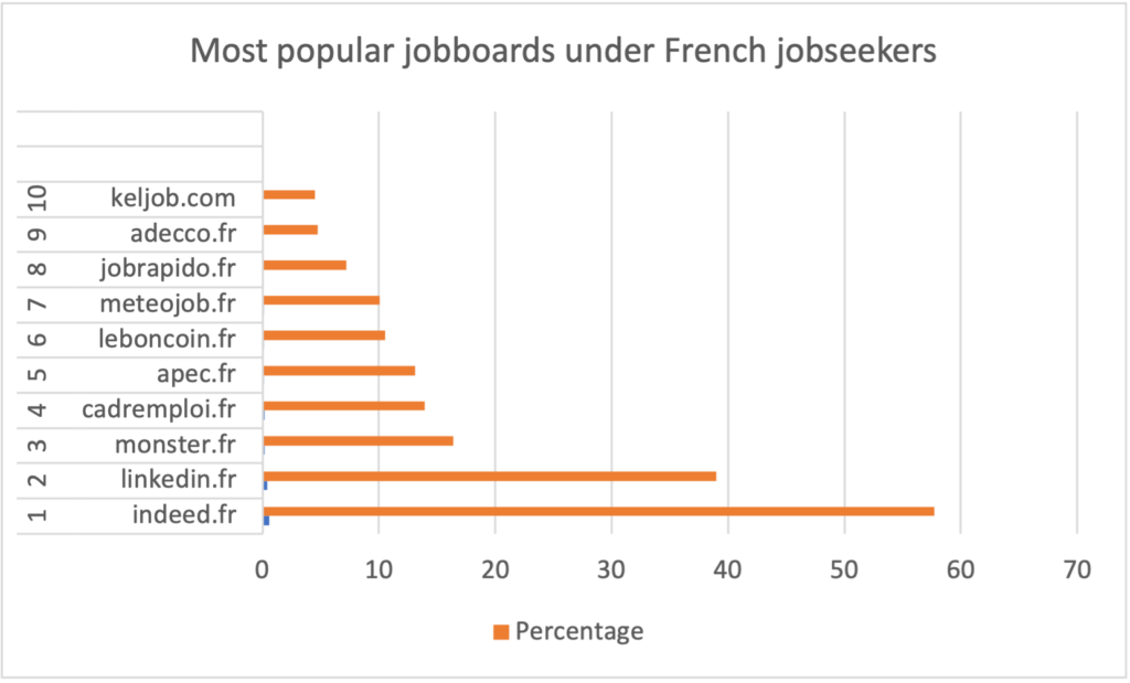 Every year, Rotterdam-based labour market data analysts Intelligence Group delves into the most-used job boards by active job seekers. For France, the 2020 rankings see Indeed rank supreme with a 57.7% share. It is closely followed by LinkedIn (38.9%) and Monster (16.4%). Remarkably, StepStone.fr only ranked 28th out of 58 job boards, with a market share of 0.7%. That is quite the contrast to the German rankings, where StepStone.de trails only Indeed, with a market share of 39.4%.