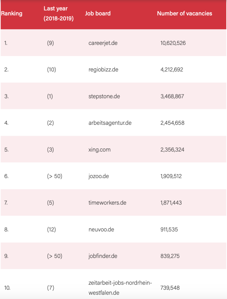 Whereas it was responsible for double the size in the total number (10.6 million compared to Regiobizz’s 4.2), its lead goes down to 700.000 in the non-intermediary standings. Last year’s leader Stepstone, is second in this category, with roughly 3 million vacancies. Though again, its rise compared to 2018’s statistics, is remarkable. Last year, Careerjet came in 10th in this category, now it is firmly placed at #1.