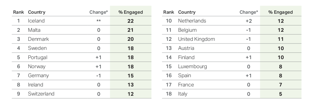 Over the last decade, the overall sentiment to come out of the European employee engagement statistics has been largely positive. When Gallup started measuring the global number 2009, the average was 12%. In the 11 years since then, that number has gone up to 20% — albeit with the pandemic ensuring a 2% decrease from 2019 to 2020.
