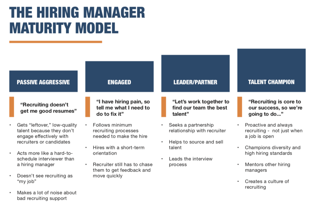 Recruiting Toolbox is set up to improve hiring manager capabilities and to totally transform them from passive participants in an interviewing process, ready to indulge in complaining and criticising, to Talent Champions, leading the recruiting process, interviewing strategy, diversity, selling and training, as illustrated in the following Hiring Manager Maturity Model. One thing is true: all types of Hiring Managers attract the kind of talent they deserve