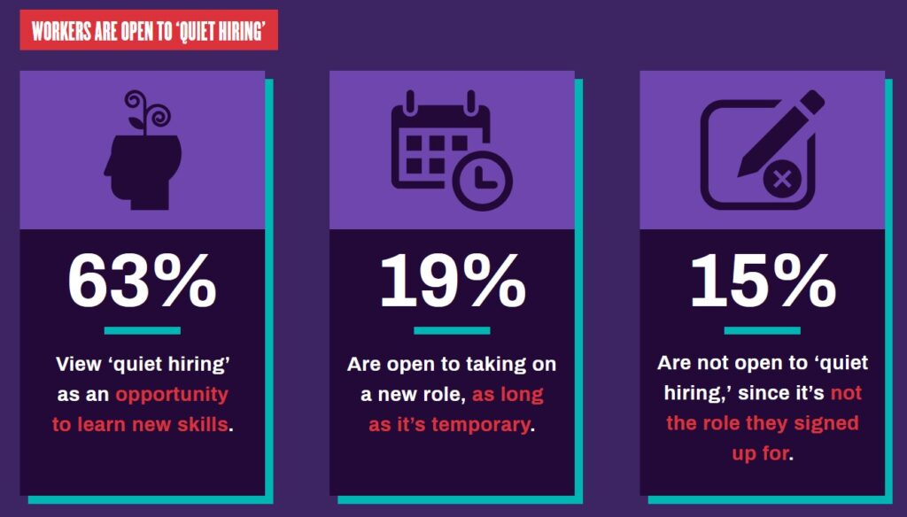 Buzzwords may be buzzwords, but according to McRae, Quiet Hiring just may stick around. “The reality for the next year is — whether or not we go into a recession — everyone’s a little nervous,” McRae says. “In a lot of cases, organisations are not necessarily doing a hiring freeze, or layoffs, but maybe slowing down a little bit on their hiring.”