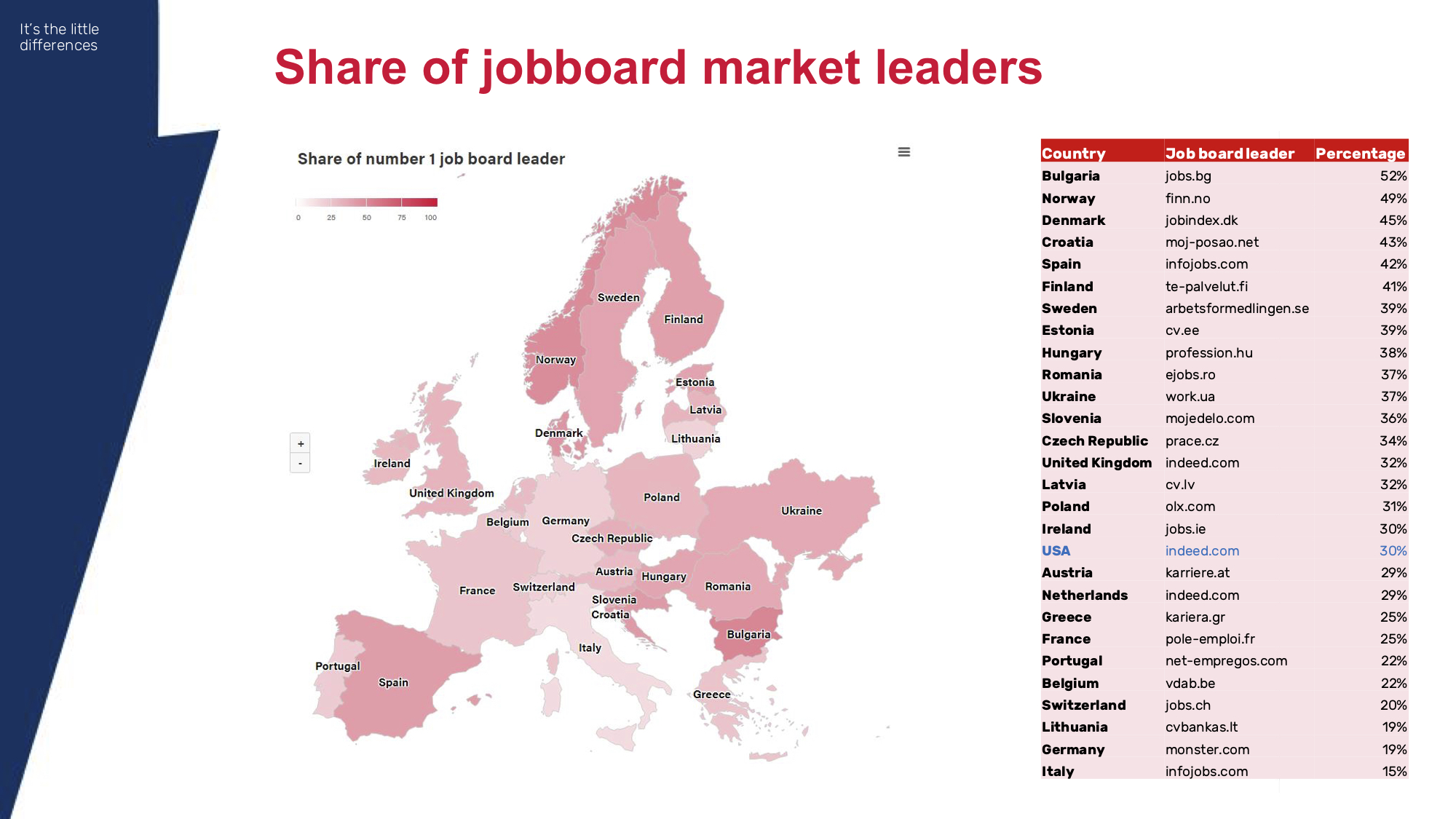 A couple of European countries do, however, have one clear-cut number one job board. In Bulgaria, Jobs.bg holds a 52% share, Norway’s Finn takes up 49%, Denmark’s Jobindex has a 45% share — while in Croatia Moj-posao.net takes up 43% and in Spain, 42% the majority of job seeking population takes to Infojobs.com. But it’s mostly a tale of a fragmented continent. With market leading percentages below 25%, Portugal (22%), Belgium (22%), Switzerland (20%), Lithuania (19%), Germany (19%) and Italy (15%) all are much more fragmented markets.