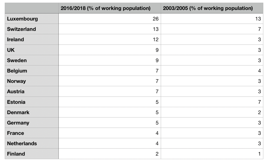 The total number of knowledge migrants in Europe has pretty much doubled. During 2003 and 2005, the total accumulative percentage of all 13 countries came down to 58%. In more recent years (2015 – 2018), however, that accumulative percentage has increased all the way to 115%. Of all 13 countries for which the data exists, Estonia is the sole country where the number of knowledge migrants has decreased.