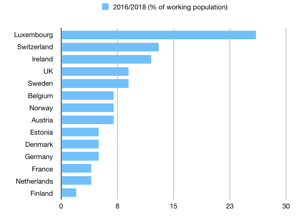 In total, the two companies received answers from a total of 300 respondents from 60 nationalities. Surprisingly, on the basis of new research into international knowledge workers in 13 European countries, The Netherlands trails only Finland for last place. Amounting to a total number of 383.000 international knowledge workers, they only make up 4.2% of the entire Dutch working population. Luxemburg, for obvious financial banking-related reasons, ranks atop the list.