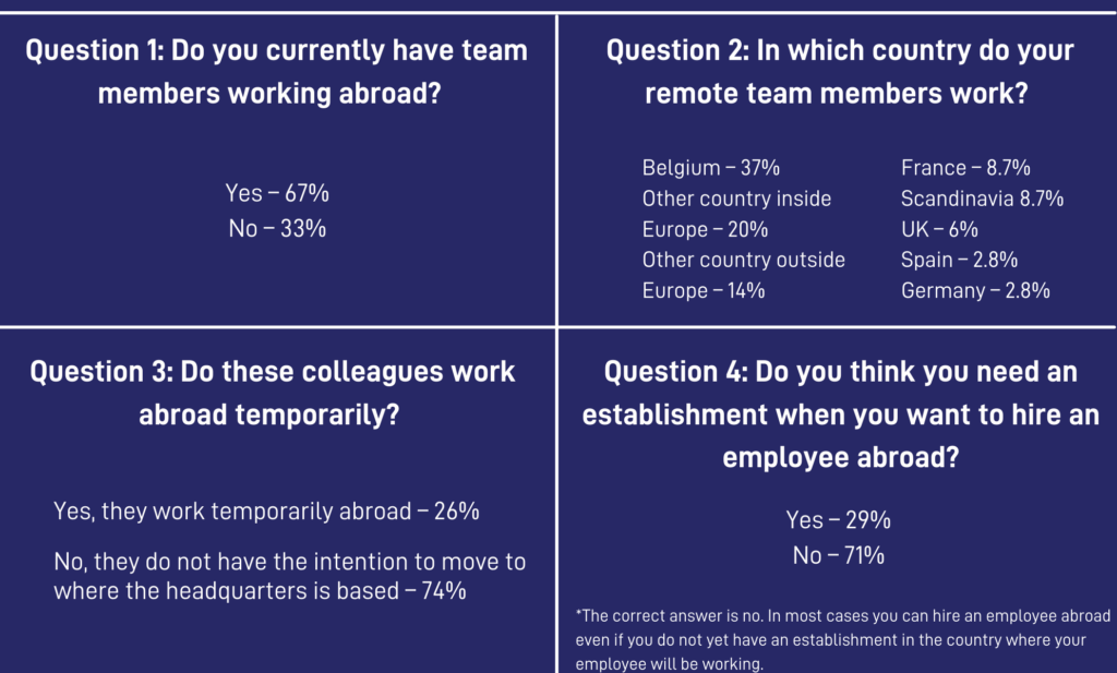 According to Undutchables’ poll, 67% of Dutch companies have team members working abroad. Location-wise, Belgium seems to be the common destination, with 37% of organisations having team members work in their neighbouring country. Surprisingly, only 14% of those polled saying they have team members working ‘outside of Europe’.