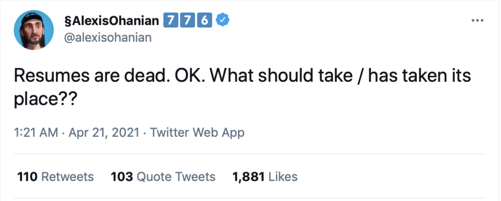 Above all, most of the suggestions below Ohanian’s controversy-laden Twitter post revolved around skills and some type of digital media. Artist Drue Katoaka shared the story of how she was recently asked to share a CV, describing the experience as ‘archaic’. “CV’s are static, not living-documents. They are text-heavy, stiff and no use of rich media and visual. They are dead on arrival”, she said.