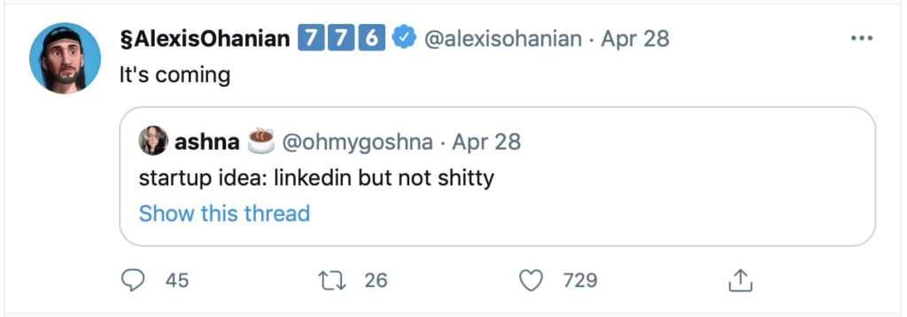 The clearest takeaway, however, may be that while some of the hundreds of responses shared some resemblance, the simple fact is that there is no clear-cut alternative. And one could speculate that Ohanian may be onto something, based on the tweet that came in response to yet another entry for his suggestion box: ‘LinkedIn, but not shitty’. ‘It’s coming’, Ohanian not-so-cryptically replied.