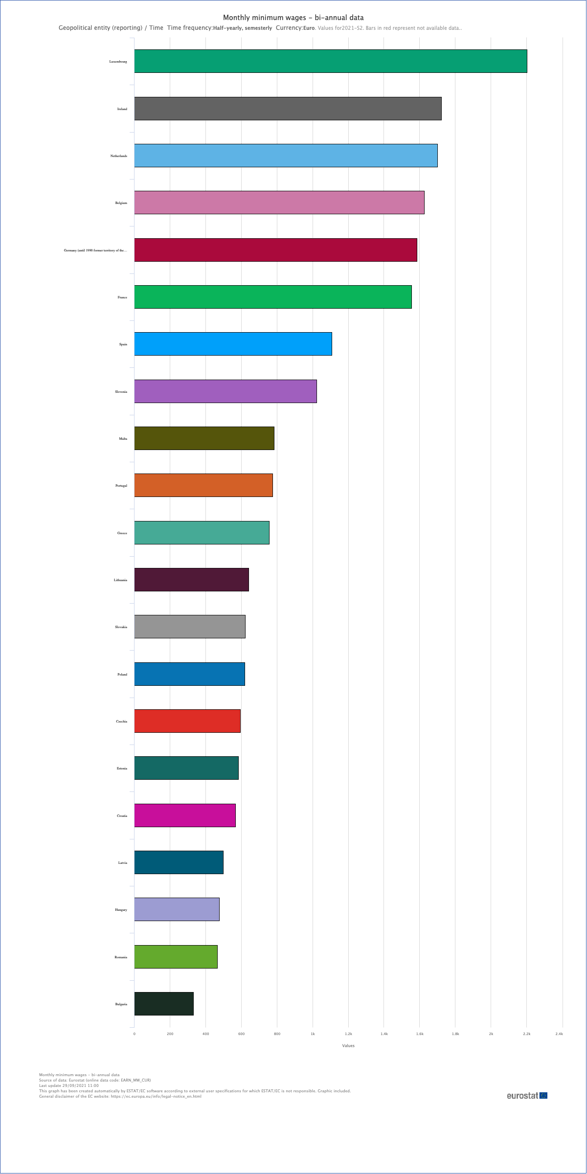 Notably, every EU member state except for Belgium, Spain, Greece and Estonia recorded some type of growth in its minimum wage. Slovenia leads the category in terms of the percentage growth (8.4%) of the minimum wage in the second half of 2021 compared to the second half of 2020. Latvia (7%) ranked second, while Luxembourg (5.9%), Czech Republic (5%) and Slovakia (4.3%) round off that top 5. Turkey, not a EU member state, was the only country within the European hemisphere to see a decrease (-3.7%) in its minimum wage. The country’s minimum wage went from 383,40 euros to 346,62 euros.